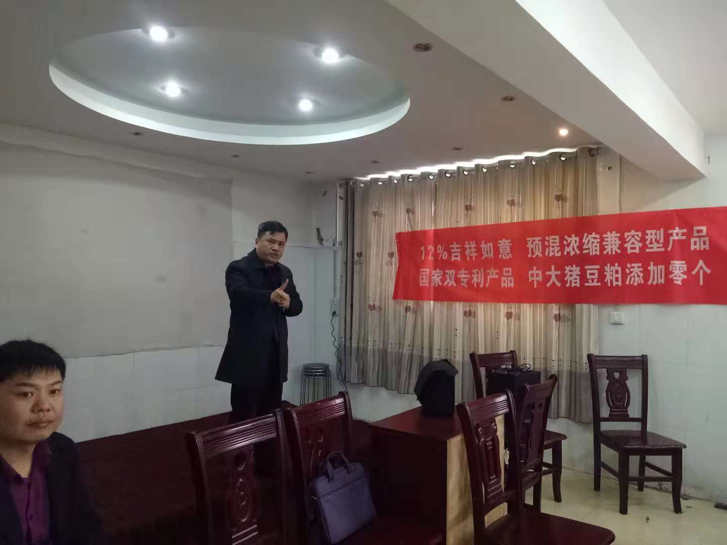 會(huì)議于10點(diǎn)30分在汪總的主持下正式開(kāi)始,他首先介紹了參會(huì)嘉賓,并歡迎參會(huì)31名豬場(chǎng)老板齊聚水云間酒店,參加學(xué)習(xí)養(yǎng)豬知識(shí);接著,營(yíng)銷(xiāo)中心南方負(fù)責(zé)人程繼亮先生介紹會(huì)議的重要性,并且詳細(xì)介紹公司功能產(chǎn)品和配料成本,特別是母豬料的功能性特點(diǎn)、仔濃的低豆粕配比優(yōu)勢(shì),得到參會(huì)豬場(chǎng)的認(rèn)可。專(zhuān)利產(chǎn)品的推廣可獲國(guó)家補(bǔ)貼、貸款的支持、非洲豬瘟保險(xiǎn)的優(yōu)先辦理等一系列優(yōu)惠政策,得到豬場(chǎng)朋友的熱烈歡迎。